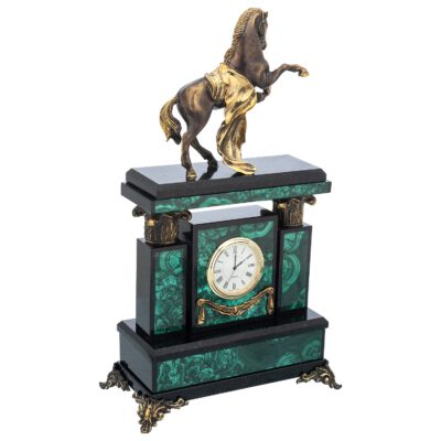 Đồng hồ bằng đá khổng tước hình con ngựa tại Luxury Gifts là sự kết hợp tuyệt vời giữa chất liệu đá tự nhiên cao cấp và biểu tượng phong thủy mạnh mẽ. Đá khổng tước nổi bật với màu xanh lục cùng các vân đá uốn lượn đặc trưng, mang đến vẻ đẹp cuốn hút và sang trọng. Hình tượng con ngựa được điêu khắc thủ công sống động trên khối đá nguyên chất, thể hiện sự mạnh mẽ, bền bỉ và tinh thần không ngừng tiến lên.