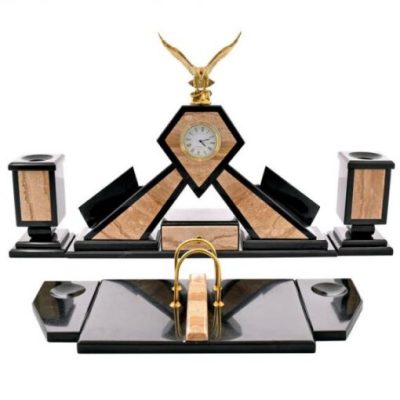 Được tạo nên từ đá tự nhiên nguyên khối, chiếc đồng hồ để bàn bằng đá tự nhiên hình Đại bàng nổi bật với sắc vân đá độc đáo. Trung tâm là mặt đồng hồ mạ vàng sang trọng, điểm xuyết trên nền đá vững chắc vừa là vật dụng theo dõi thời gian, vừa là điểm nhấn trang trí thanh lịch cho bàn làm việc.